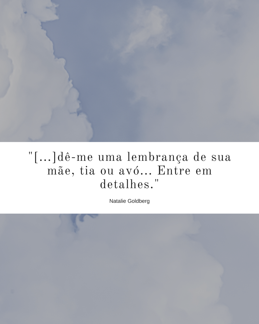 “Você tem três minutos para responder. Certifique-se de estar sendo específico. Nada vago. Talvez você queira começar cada resposta com ‘Eu me lembro’. Dê-me uma lembrança de sua mãe, tia ou avó… Entre em detalhes.” (Natalie Goldberg) Você não chegou neste mundo sozinha… uma mulher te transportou para cá ao…